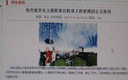 2010年5月4日,深圳市綠色產(chǎn)業(yè)促進(jìn)會負(fù)責(zé)人在5月3日的深圳電視臺和5月4日的《深圳特區(qū)報(bào)》獲悉我司在上海世博園承建的上海企業(yè)聯(lián)合館霧化特效工程正式使用后,專門打來電話表示祝賀,并在官方網(wǎng)站上以“熱烈祝賀東方祺勝霧化特效工程世博園正式使用”為題,慶賀我司霧化特效工程啟用。全文如下: 由我會副會長單位深圳市東方祺勝實(shí)業(yè)有限公司承建的上海世博會上海企業(yè)聯(lián)合館外框霧化特效工程正式投入使用。該特效系統(tǒng)設(shè)計(jì)遵循低碳綠色的理念,水源來自于雨水凈化,既美化了環(huán)境、凈化了空氣,又有效降低了室外游客等候區(qū)氣溫的作用。